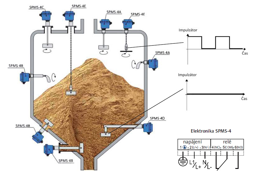 Hladinové spínače SPMS-4 jsou určeny k signalizaci maximální nebo minimální hladiny sypkých materiálů v otevřených, nebo tlakových nádobách. Mohou být použity k aktivaci akustických a optických signalizačních systémů, či blokovacích zařízení zapojených do pneumatických, dopravních a transportních systémů pro sypké materiály.